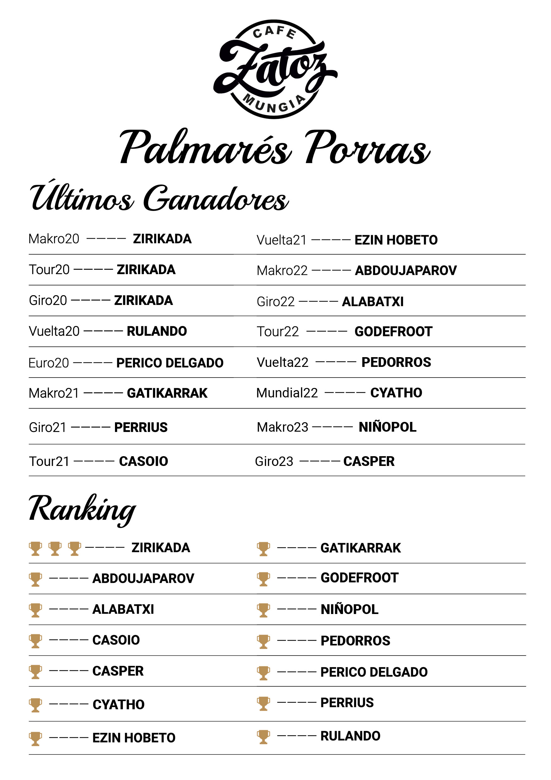 Llega la esperada PORRA ZATOZ del TOUR23 y ya hemos definido el grupo de CRACKS del cual elegir los 7 primeros PRONOSTICOS.